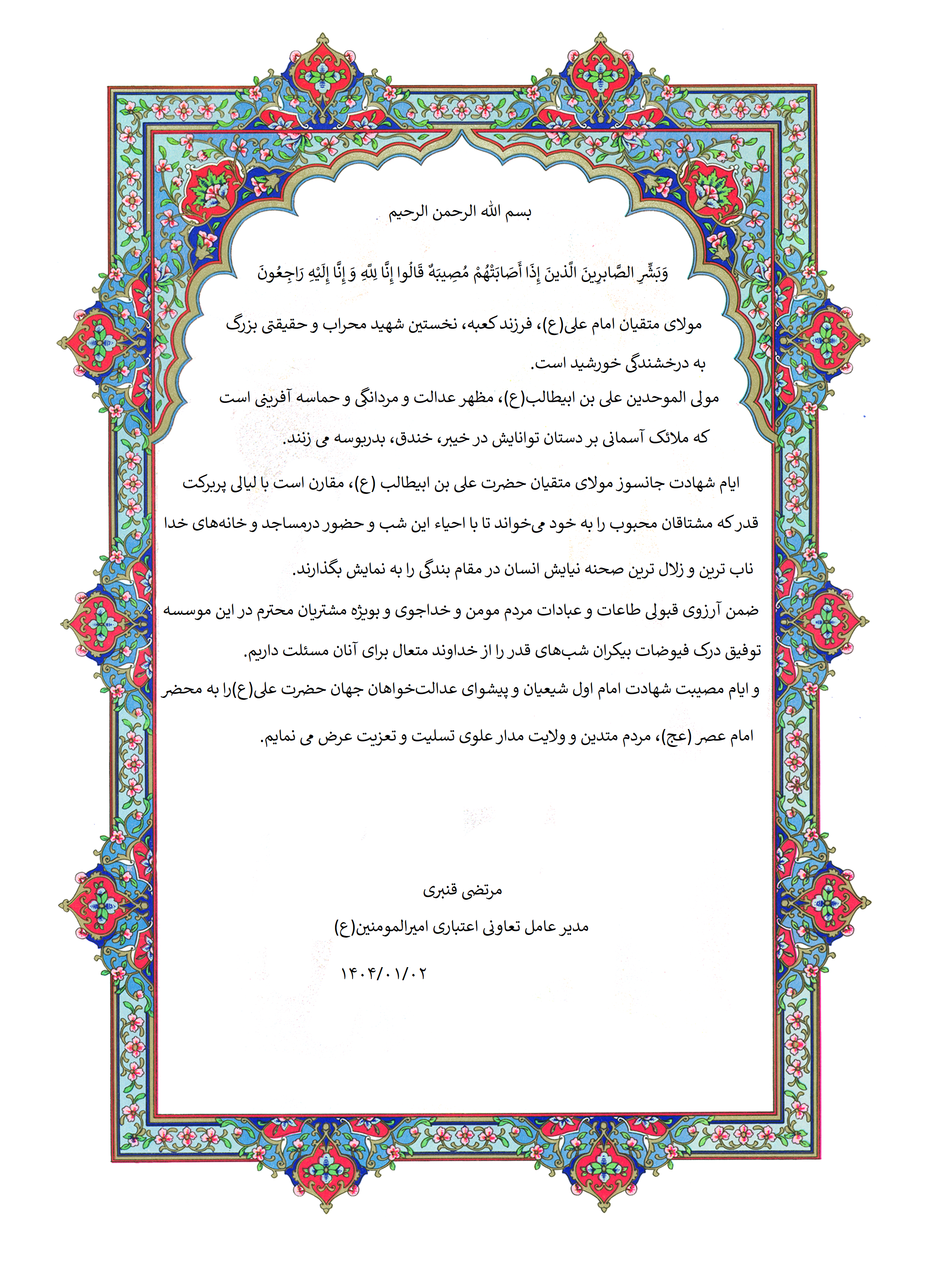 پیام تسلیت مدیرعامل موسسه امیرالمومنین(ع) بمناسبت شهادت مولی الموحدین امیرالمومینن علی(ع):